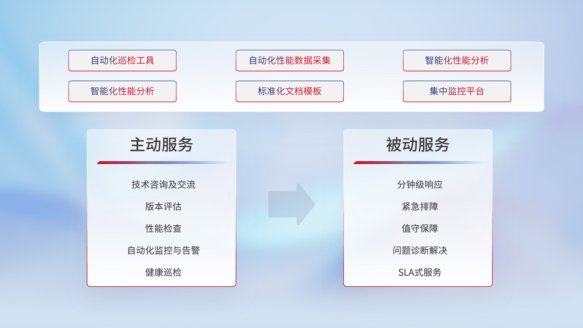 智能化工具和标准化文档,,,,保障服务质量,,,,提供主动服务(包含技术咨询、、、、版本评估、、、性能检查、、自动化监控与告警、、、、健康巡检)和被动服务包含(分钟级响应、、、、紧急排障、、、、值守保障、、、问题诊断解决、、、、SLA服务)。。