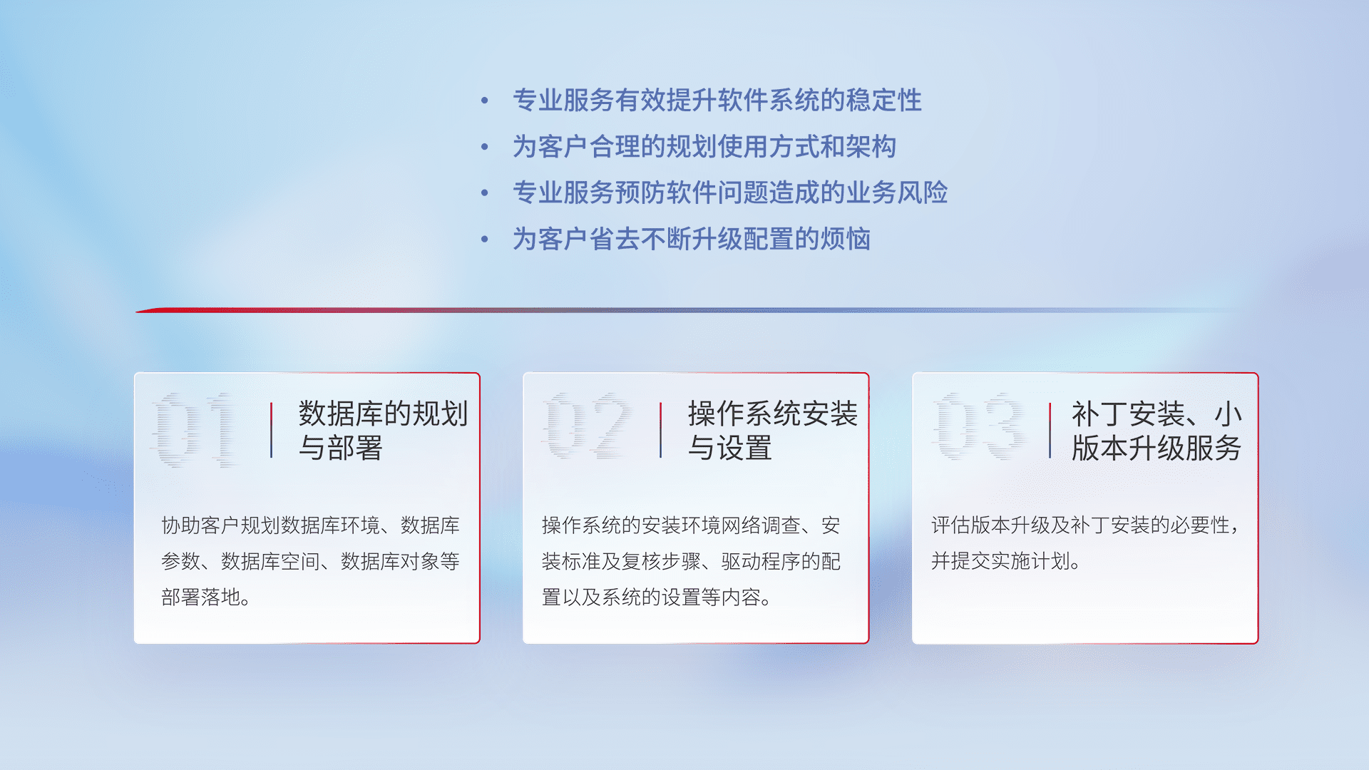 为客户提供软件规模升级、、、、快速部署、、、、按需配置的专业服务,,,从数据库的规划与部署到操作系统的安装与设置,,,再到补丁安装和小版本升级提供支持。。